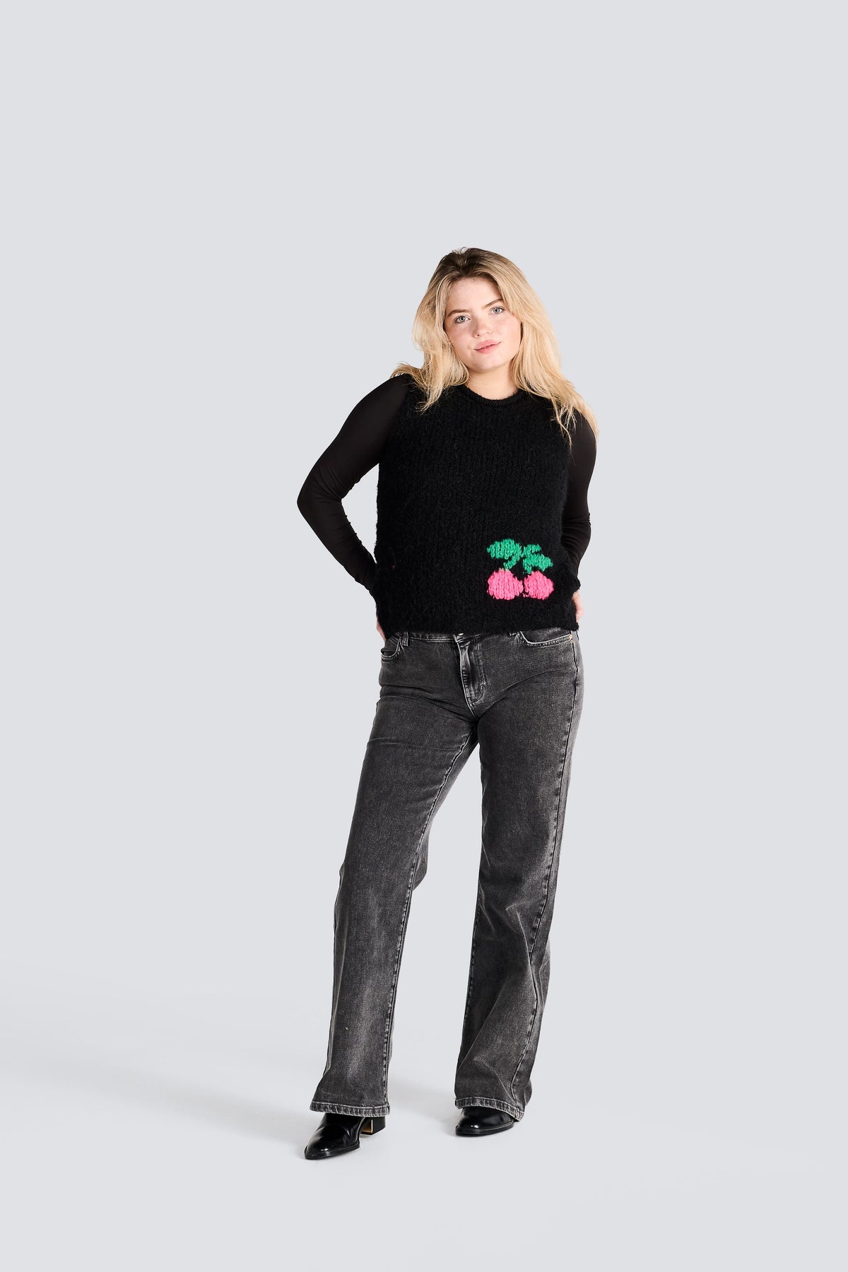 Add a playful and trendy touch to your wardrobe with our Sleeveless Cherry Knit Sweater. Featuring a adorable cherry design, this fun and casual piece is perfect for layering over your favourite tops. Crafted from a blend of sustainable and comfortable fibers—including 49% recycled materials—this sweater offers a cozy feel with a stylish edge. Available in three versatile sizes it’s a fun, cute, and trendy addition that effortlessly elevates your everyday look.